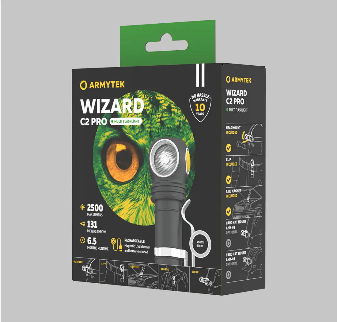 Wizard C2 Pro to pierwsza latarka z najnowszej generacji multi-latarek Armytek. Zaprojektowana dla profesjonalistów i użytkowników wymagających absolutnej wszechstronności, oferuje połączenie ekstremalnej jasności, długiego czasu pracy i wyjątkowej wytrzymałości. To idealne rozwiązanie dla służb technicznych, outdooru, sportu, przemysłu, ale też codziennego użytku.