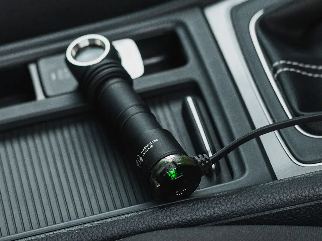 Ładowanie odbywa się za pomocą magnetycznego kabla USB, który można podłączyć do dowolnego źródła zasilania. Silny magnes w tylnej części obudowy umożliwia stabilne zamocowanie latarki do powierzchni metalowych, co zwiększa jej funkcjonalność w pracy i terenie.